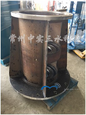 大法蘭機架的大法蘭,法蘭外徑達到1.2米,這是為提高機器運行穩定性而設計。由于這臺攪拌機的攪拌軸達到4米的長度,配置了2層外徑為3米的推進式攪拌槳,攪拌軸采用懸臂結構(底部無底軸承),攪拌機運轉的時候,機器的動能和慣性都是非常之大,我們在常規情況配置的標準機架的法蘭外徑的基礎上采用了1.5倍的安全系數,這將大大提高攪拌機運轉的穩定性。