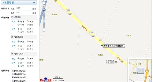 2.設置地圖,一般這里選用的默認值寬度是697,高度是550,一般不用調整,按這個默認值就可以了,但如果是自己網站頁面需要可以適當的調整下寬度和高度。